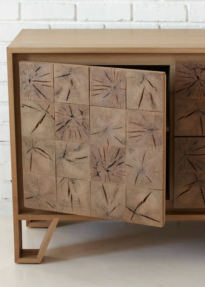 Instomi Sideboard (meaning stories in Xhosa) celebrates the uniqueness of timber and tells the story of the tree from which it is made. Using a repeat pattern of the pith of the tree with a timber or metal surround, this design reveals the lifeblood of the tree while the end grain allows us to calculate the age of the tree and to see the conditions in which it grew. The sturdy legs have been cleverly integrated into the design to create an interplay between positive and negative space. Available in ash and oak, the sideboard can be custom-made to size.